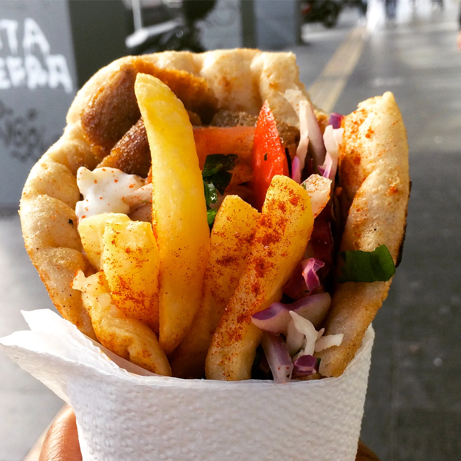 Traditional gyros have french fries in them! This particular gyros is from Sabbas Kabap in Athens, Greece